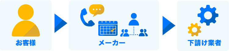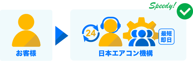 お客様がメーカーに修理依頼をすると、メーカーから下請けの修理業者への調整が入ります。日本エアコン機構は、24時間365日の電話受付で高品質な修理業者へのネットワークに接続。最短即日での対応が可能です。
